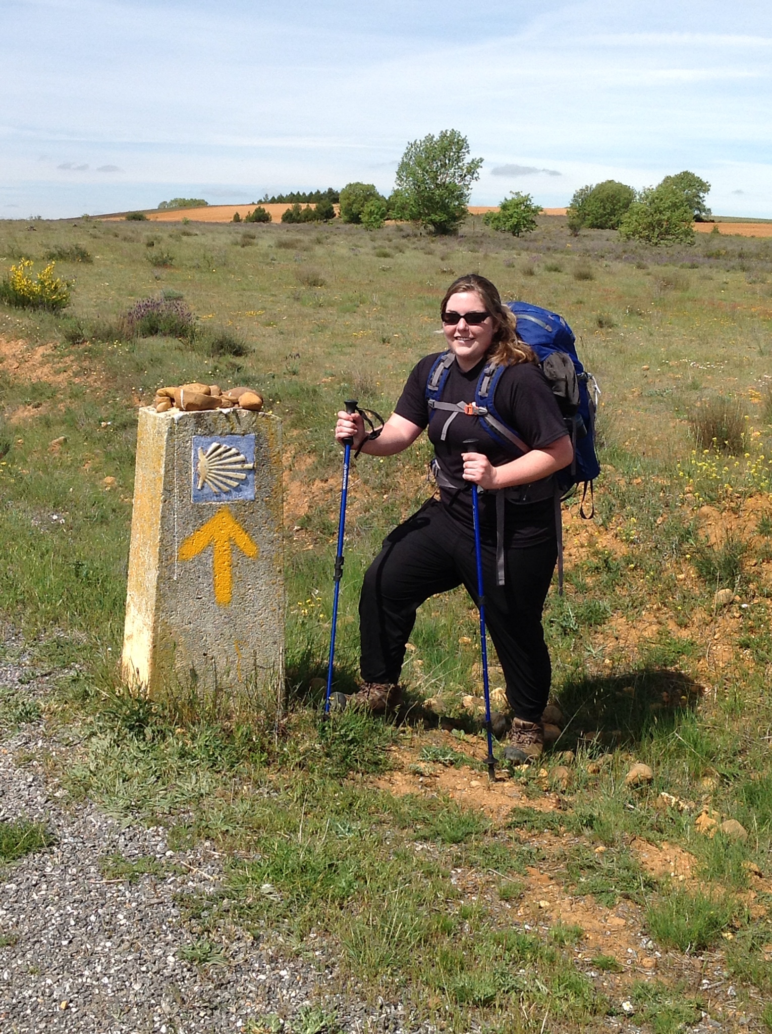 Rachel, a graduate assistant, poses at one of the Camino markers. Scallop shells lead the way to Saint James in Santiago.