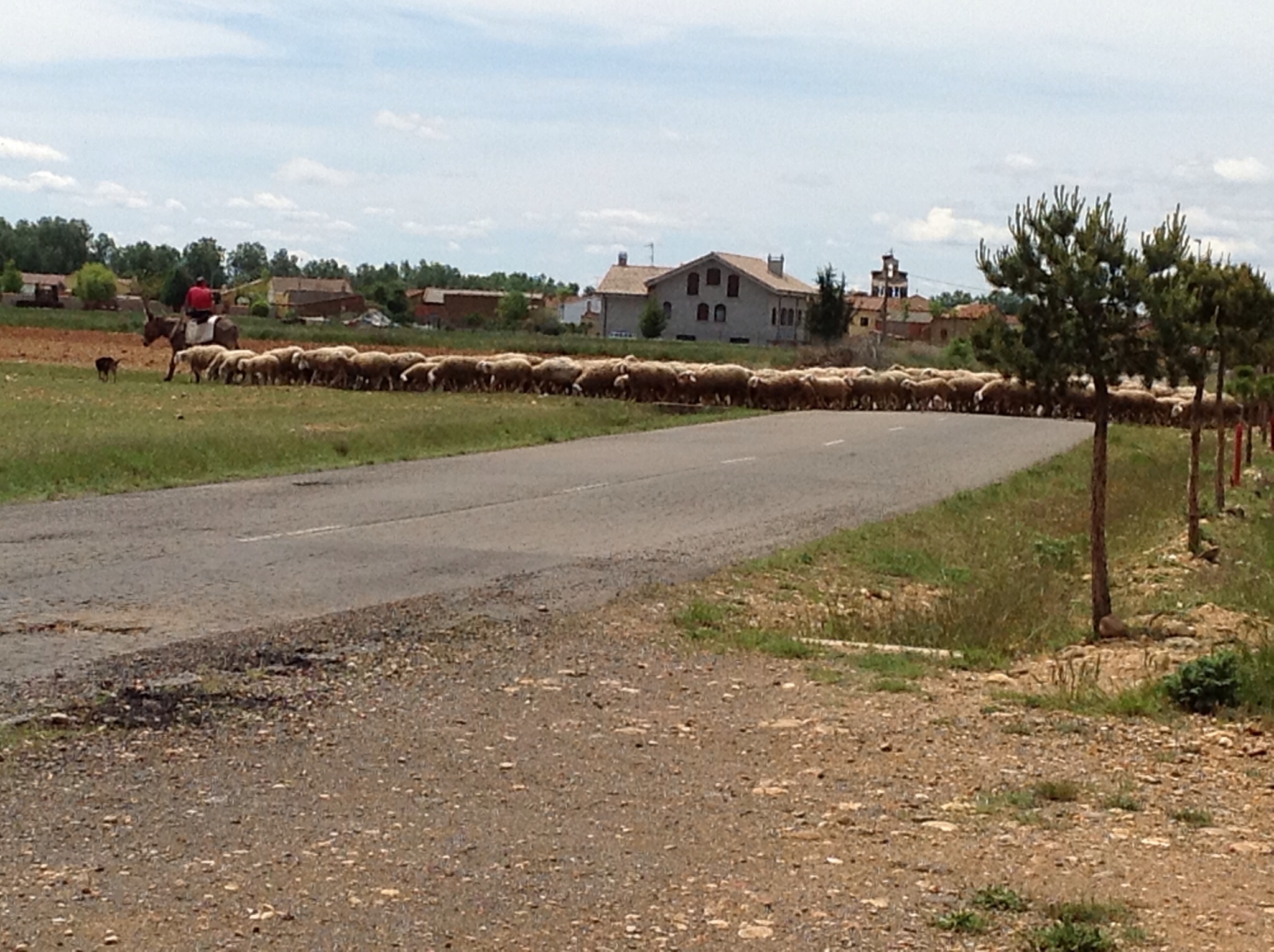 Past the grand cathedral of Leon, down city streets, and eventually to a dirt road, Day 1 of our Camino trek commenced at daylight. Twelve miles later, we arrived at the small village of Mezarife. Just outside of our destination, I took advantage of a welcoming water stop. The others, thrilled to see our aubergue, went ahead. I changed to sandals, sprawled across an inviting bench, closed my eyes, and mulled over the day. Moments later I was delightfully surprised by a farmer on a burro, leading a large herd of sheep across the Camino – shades of Plantation Road!