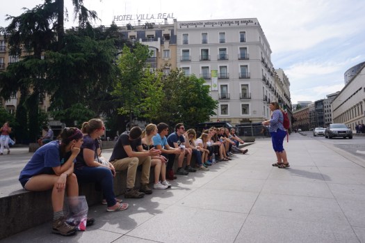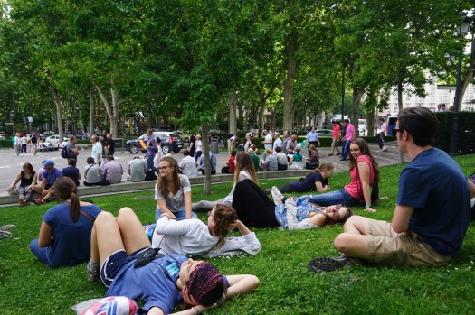 Some jet-lagged Hokies rest on the lawn of the Prado before going in to see some Goya (and Velazquez, et al.)